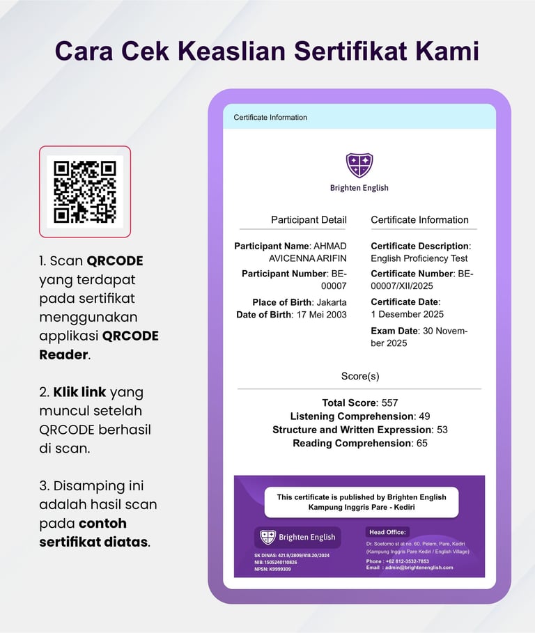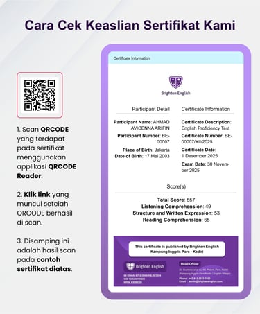 Lembaga Brighten English adalah lembaga kursus bahasa Inggris resmi yang terdaftar di Dinas Pendidikan dengan nomor NPSN K9999309 dan SK Dinas SK 421.9/2809/418.20/2024.