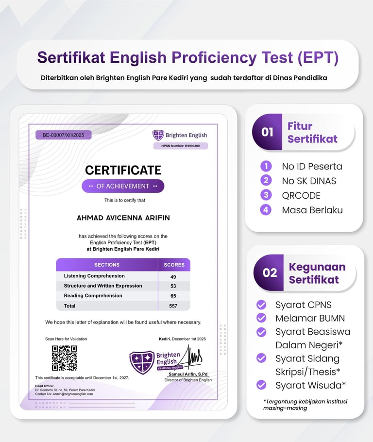 Sertifikat ini adalah jenis English Proficiency Test (EPT) yang dapat digunakan sebagai bukti kompetensi bahasa Inggris sesuai kebijakan instansi penerima.